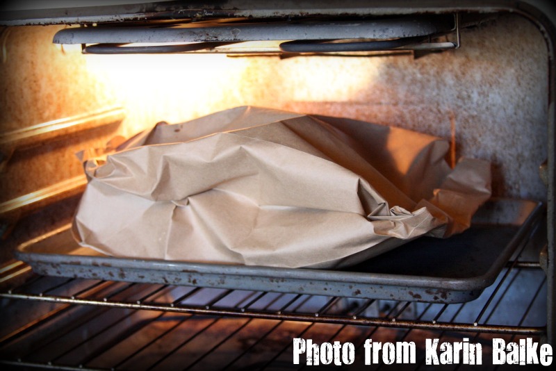 - Slide the pie into the brown paper bag and fold the top down. Staple bag shut and place it on a sheet pan. Bake for 1 hour.