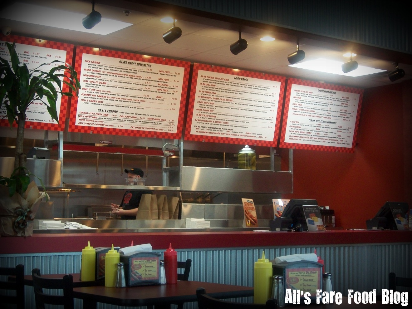 Dr. Dawg is located in a little strip mall that also has a Stone Creek Coffee, sushi restaurant and Pick ‘n Save grocery store. The restaurant seats a fair amount of people at tables or booths. The decor is clean in reds, whites and blacks. The kitchen is clearly visible from behind the cash registers.