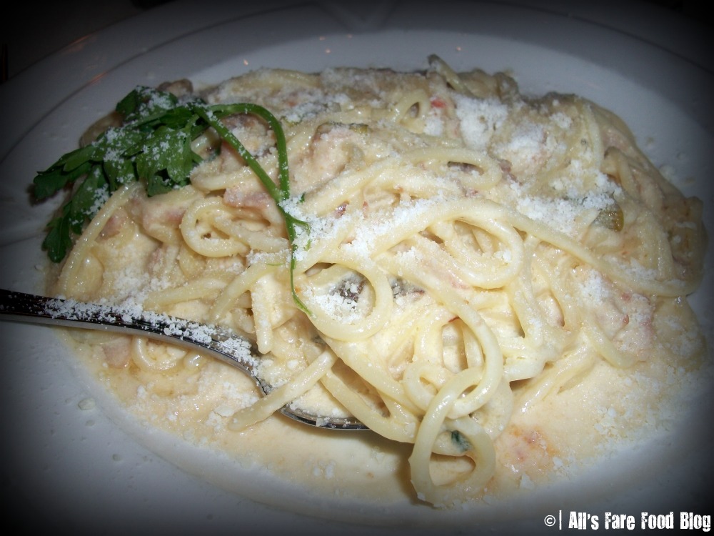 For entrees, Brett ordered the spaghetti carbonara - spaghetti noodles mixed in a rich cream sauce with bacon and just a hint of egg.