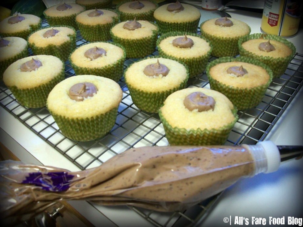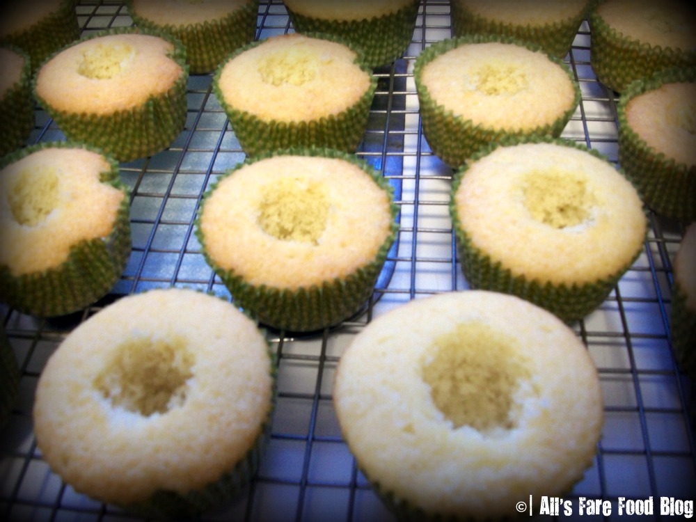 Place some of the filling into a piping bag and fill the cupcake holes until the filling is level with the cake.