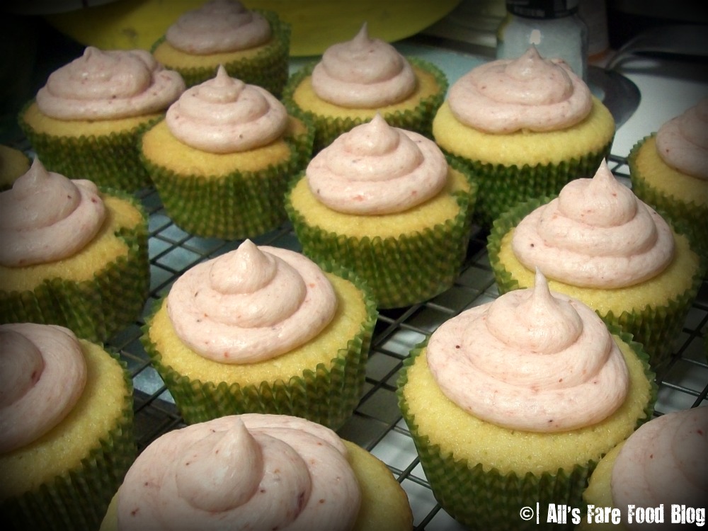 During Hurricane Irene I scoured the internet and some recipe books I had at home but couldn’t find any recipes out there specifically for this dessert. So, I pulled together some basic recipes for vanilla cake, chocolate frosting and strawberry frosting, and voila! The Neopolitan Cupcake has been born.