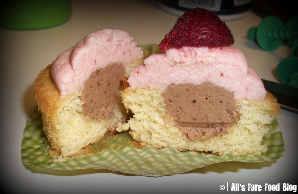 The result is a moist, vanilla cake stuffed with chocolate frosting, then topped with a strawberry buttercream. If you’re indecisive like me, then I don’t think you’ll be disappointed in this cuppie with three of America’s favorite flavors all in one bite!