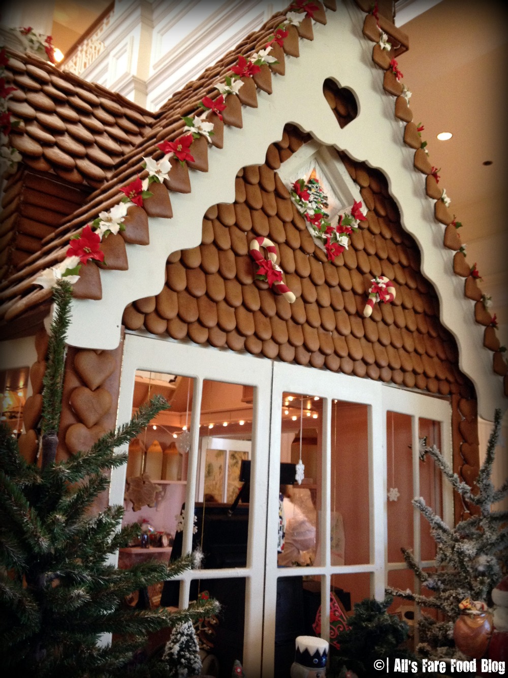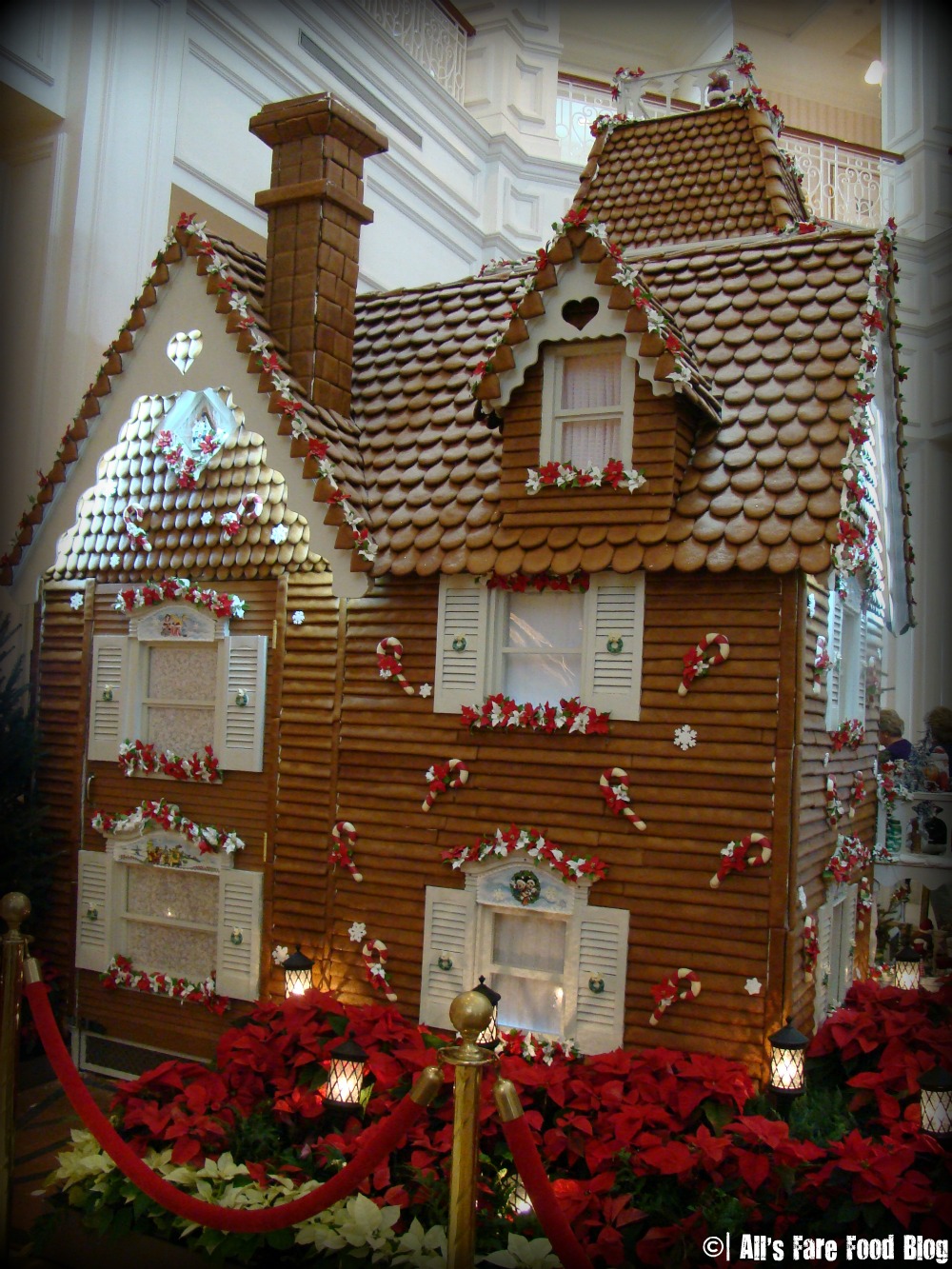 To get the best perspective of the massiveness of the structure, head to the lobby’s second floor. Just think about it: This is a gingerbread house that has a flower garden of fresh poinsettia. It has a larger “yard” than my townhouse!
