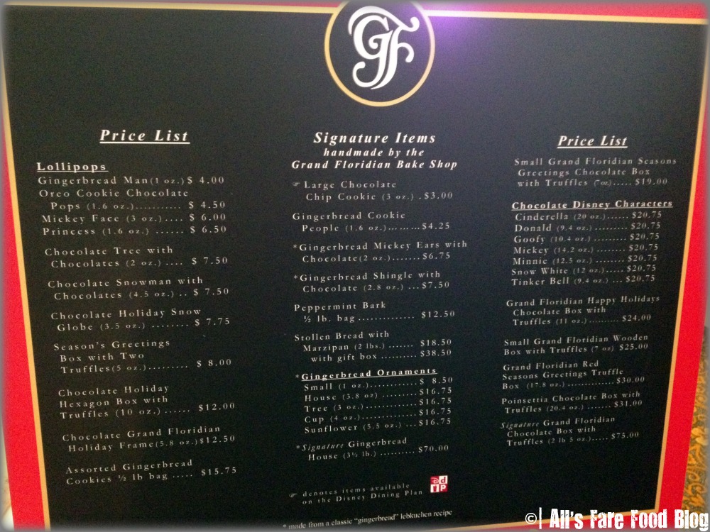 Because the house is SO massive, you can purchase some gingerbread goodies from a little retail store that resides inside it. YES! It has its own store! Take a look above at some of the items you can get like shingles, cookies, truffles, lollipops and more.