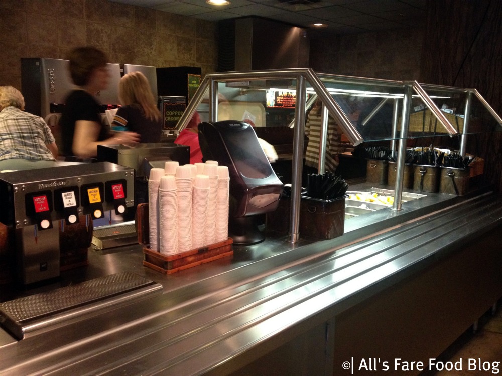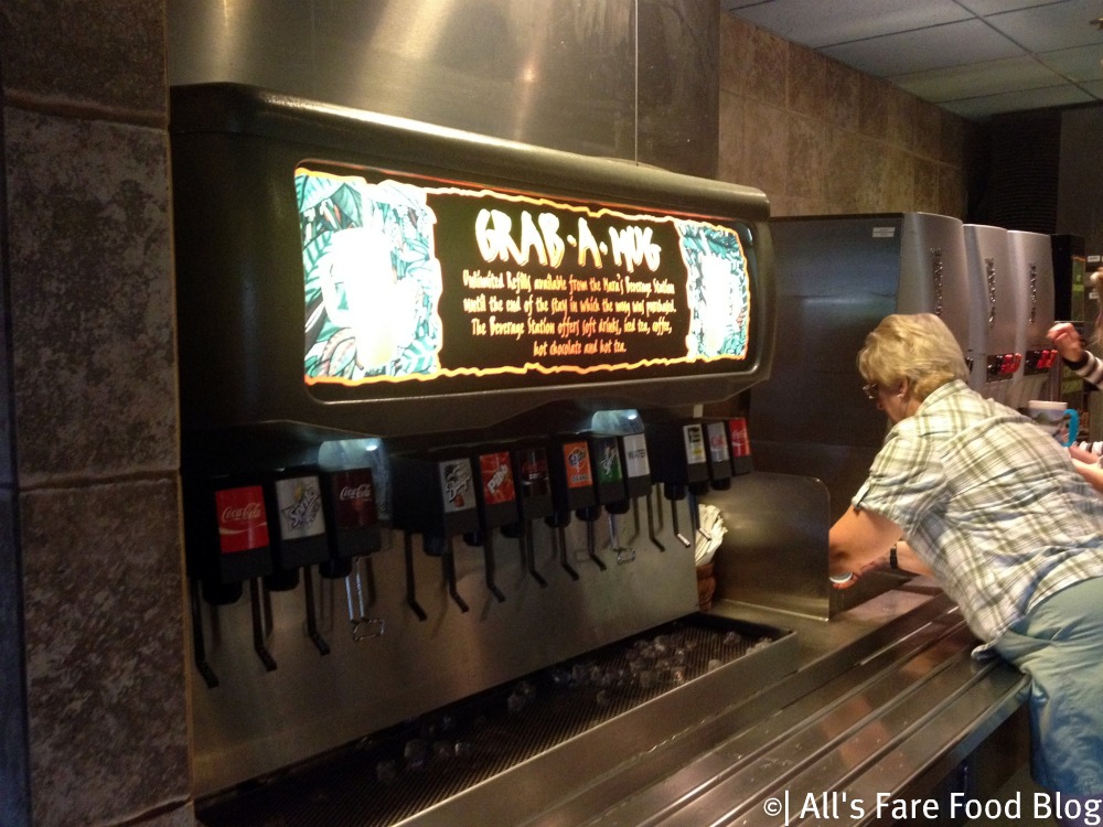 There’s a condiment bar with ketchup, mustard, and other fix-ins, as well as utensils and napkins. Surprisingly, it’s kept really clean. I always seemed to notice a cast member nearby wiping down the surfaces. If you want to take food back to your room, you can also grab to-go covers for your plates and carry bags here. They’re just stashed underneath.