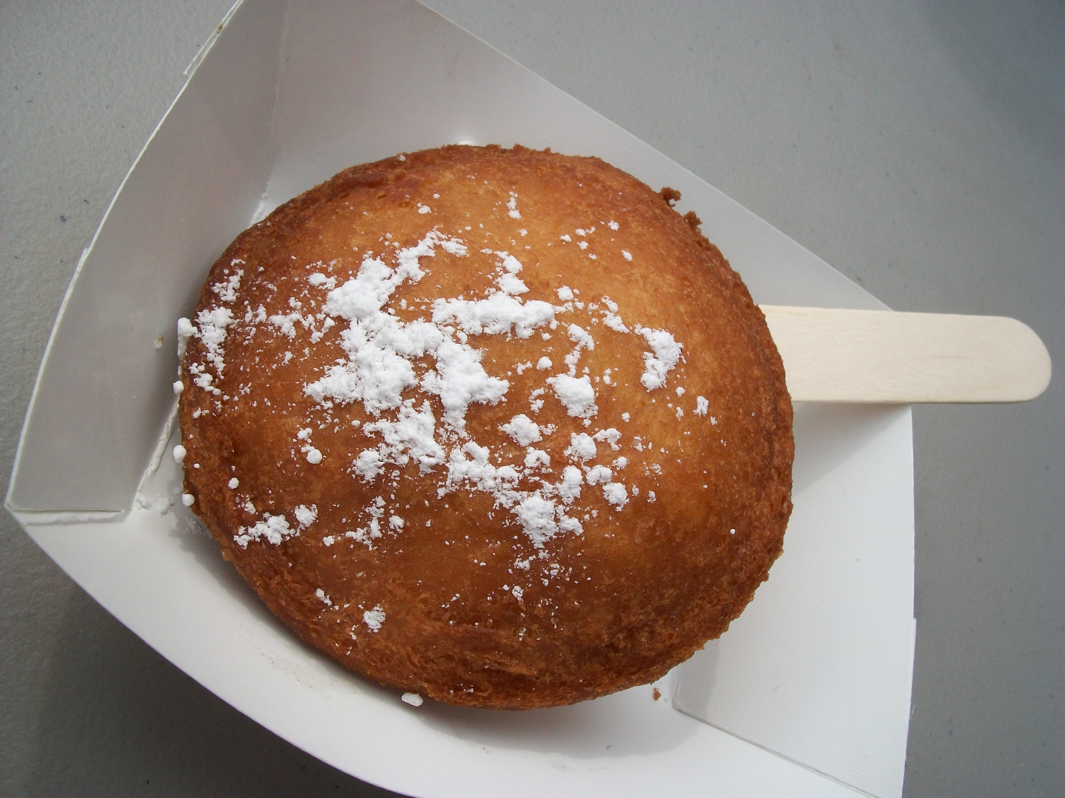 My food fiesta is nearly done. Just a few last stops. Some freshly squeezed lemonade from Catalano’s. Then, some fried cheese curds. The curds at places like Culver’s and elsewhere during the year have nothing against the cheese curds at the state fair. The fair’s curds have a light, airy battered coating. The cheese, all white cheddar, is stringy and makes your mouth happy. They’re little nuggets of joy that come once a year! You have the option to get condiments like Ragu spaghetti sauce or ketchup, but these little bundles don’t need any dressing up. They’re good on their own!