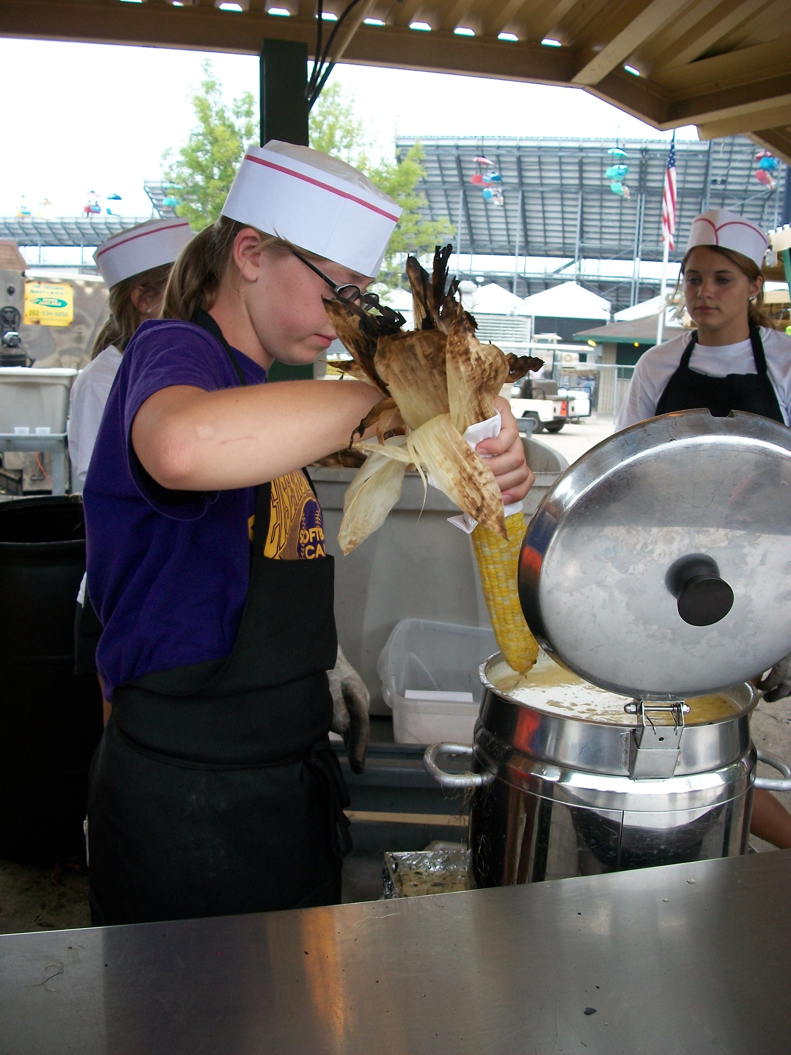 Our next culinary stop at the Wisconsin State Fair was the New Berlin Lions Club corn roast. I LOVE THIS CORN! The only thing that could make this booth any better was if some dental company sponsored tooth floss at the end. Although, they do provide you with toothpicks. This corn is just amazing. Girls will dip your corn (with the husk still attached) in a vat of hot, butter goodness. The dripping corn concoction spills all over your clothing, down your arm. But you don’t care. It’s sweet. It’s tasty. And corn = summer.