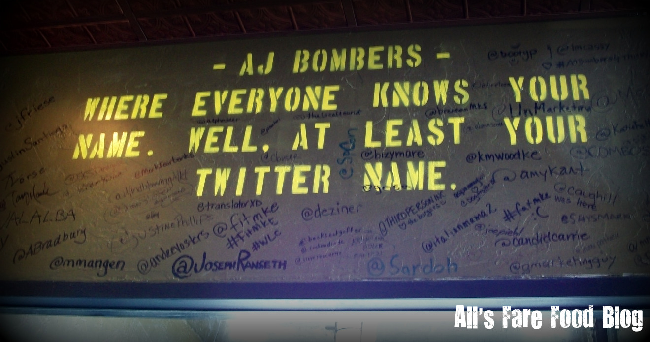 Everyone may not know your real name, but they sure know your Twitter handle. Leave your mark wherever you can find room (they’ll supply the Sharpie). Haven’t followed AJ Bombers on Twitter yet? Find them @AJBombers. Owner Joe Sorge has done a great job of using social media sites to market his restaurant. He’s even been featured in some national media like the Wall Street Journal, The New York Times and CNN. Tweet or check-in on Foursquare about your trip to Bombers and you may be rewarded with a free pnut bomb or a cookie. If it’s your birthday during the week, the burger’s on them.