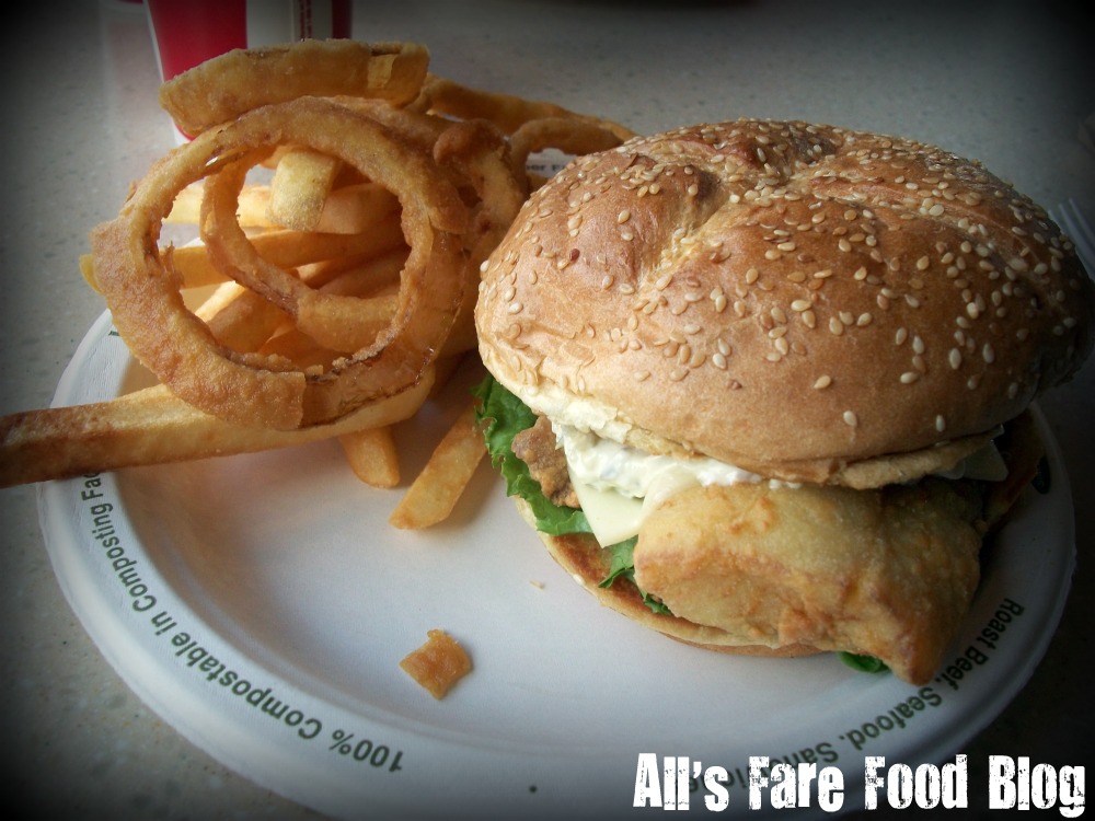Brett, while wanting a roast beef the entire drive to the restaurant, ordered the fish sandwich. White fish is fried and perched atop a grilled bun with tartar sauce and the trimmings. He ordered a side of onion rings, that like their French fry cousins, were nothing too special. He commented that the portion was definitely large enough and the sandwich was full of good flavors. It also wasn’t too greasy and the breading-to-fish ratio was just right.