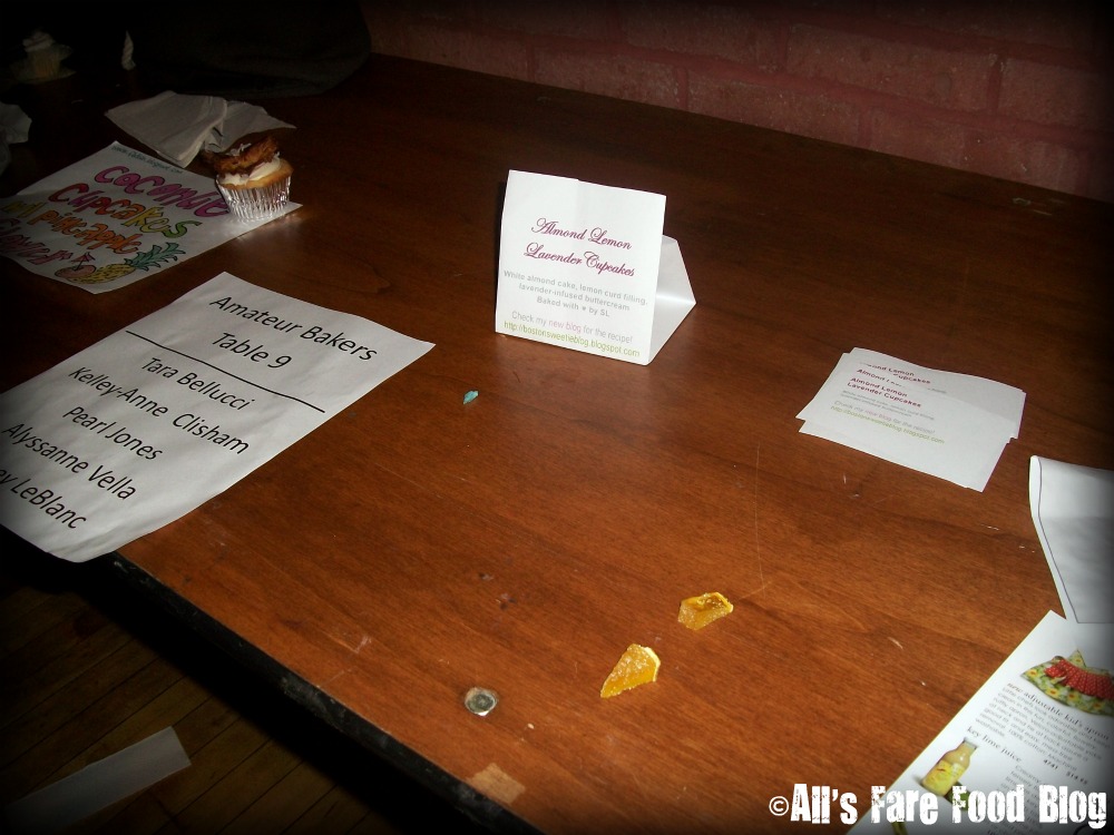 Overall, Cupcake Camp 2011 was a great experience for an amateur baker. I met a really cool 12-year-old baker - Anthony Tata, who has his own biz called “Tata Treats.” His Boston Cream cupcake was VERY good. The downside to the event was that so many people attended and ravaged the food. As a result, many attendees who arrived late, missed out on some of the best cuppies. Also, on a trip to the ladies’ restroom - out of six stalls, not one had TP and there was no paper towelling. I had to use a napkin from one of the nearby pro bakeries as a makeshift fill-in. Plus, there weren’t lots of garbage cans to toss wrappers. So, it got a bit messy towards the end of the night. I ended up stepping in some residual cupcake, which was a bit of a bummer.