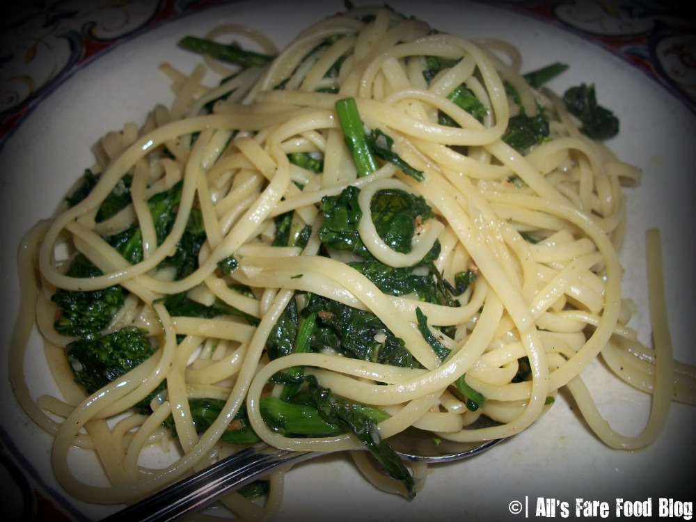 My creation started off with linguini pasta that was mixed with broccoli rabe in a light garlic and olive oil sauce, and topped off with just a twinge of parmesan cheese.