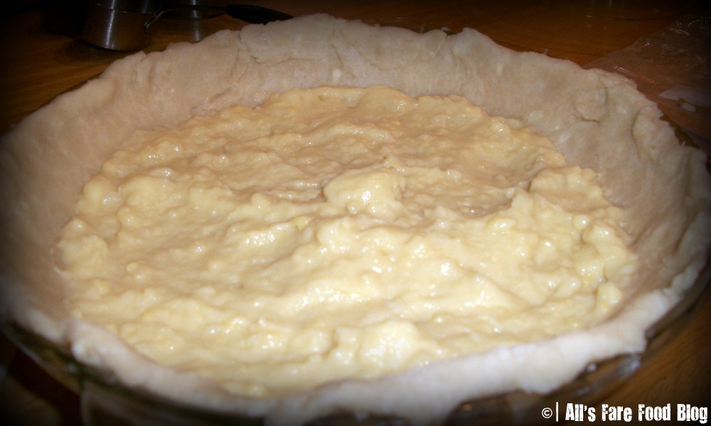 Roll out remaining pastry and cut 12 strips, 1/2 inch wide. Lightly moisten rim of the pie shell with cold water. Arrange six pastry strips across the filling; press ends to rim of pie shell. (We had a few leftover strips of pie dough so I’m not sure if that means the recipe is for a bigger pie crust, perhaps?)