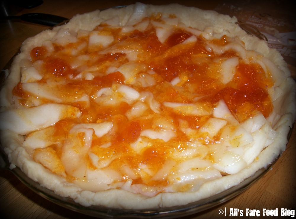 Putting it together: Roll out half the pastry and fit into pie pan. Spread custard filling evenly over the bottom, then top with apple mixture and finally with an even layer of the warm apricot preserves. (I actually substituted some fresh apricot jelly from the store at Brooksby Farms in Peabody, Mass.)