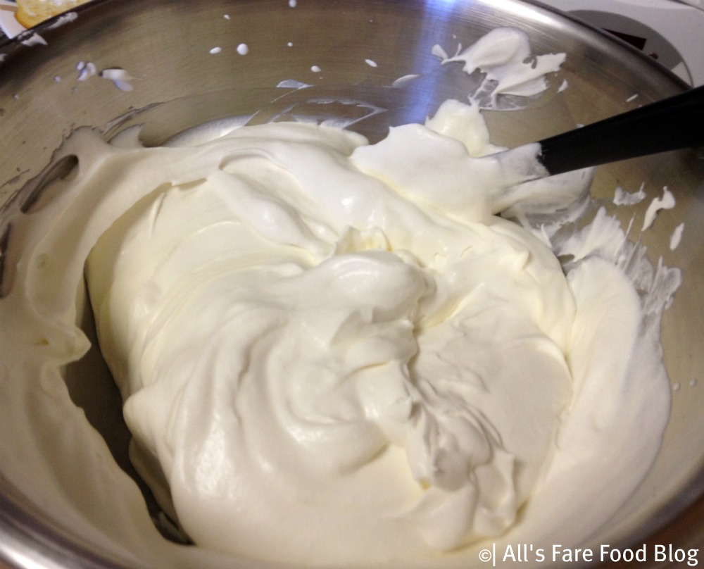 Next, to make the filling, whip the cream, sugar and vanilla until soft peaks form. Then, fold the softened mascarpone cheese into the cream.