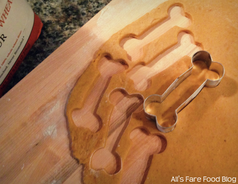 Lightly flour a work surface and dump out the dough. Knead it a few times until it forms a ball. Using a rolling pin, roll out the dough until it’s about a quarter-inch thick. Using a knife or cookie cutters, cut the dough into shapes and place on a cookie sheet. You can re-roll the scraps of dough to make more cookies. Mommy used a two-inch dog bone cookie cutter and the cookies filled up two sheet pans.